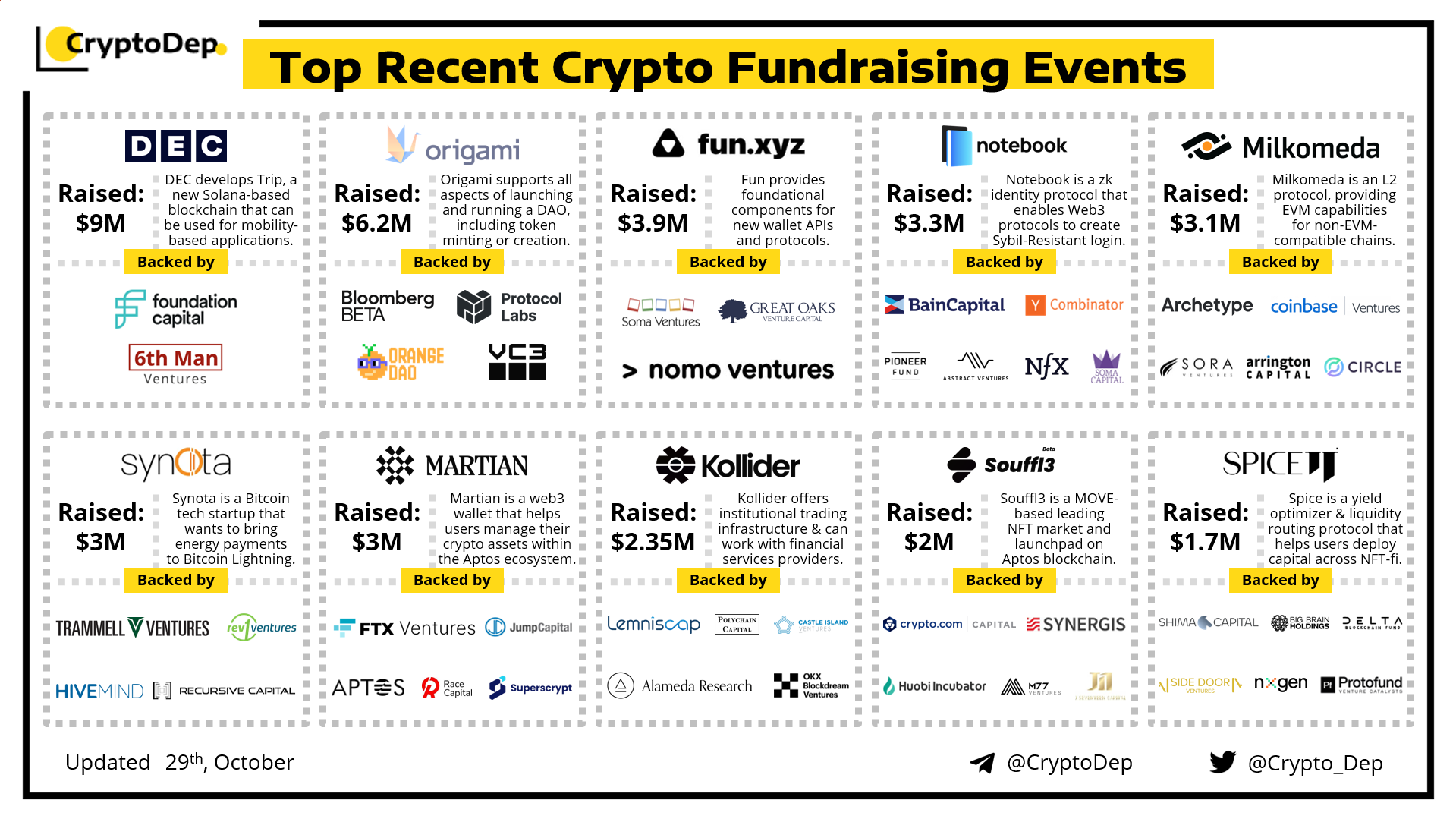 We are excited to present a list of some recent crypto fundraising events, backed by well-known investors such as Y combinator, Bain Capital, Polychain Capital, Circle Ventures, Coinbase Ventures, Alameda Research, Arrington Capital, Jump Capital, FTX Ventures, Shima Capital, Big Brain Holdings, Cryptะพ.ัะพm Capital, Huobi Incubator, OKX Blockdream Ventures, and others. Let's take a look!