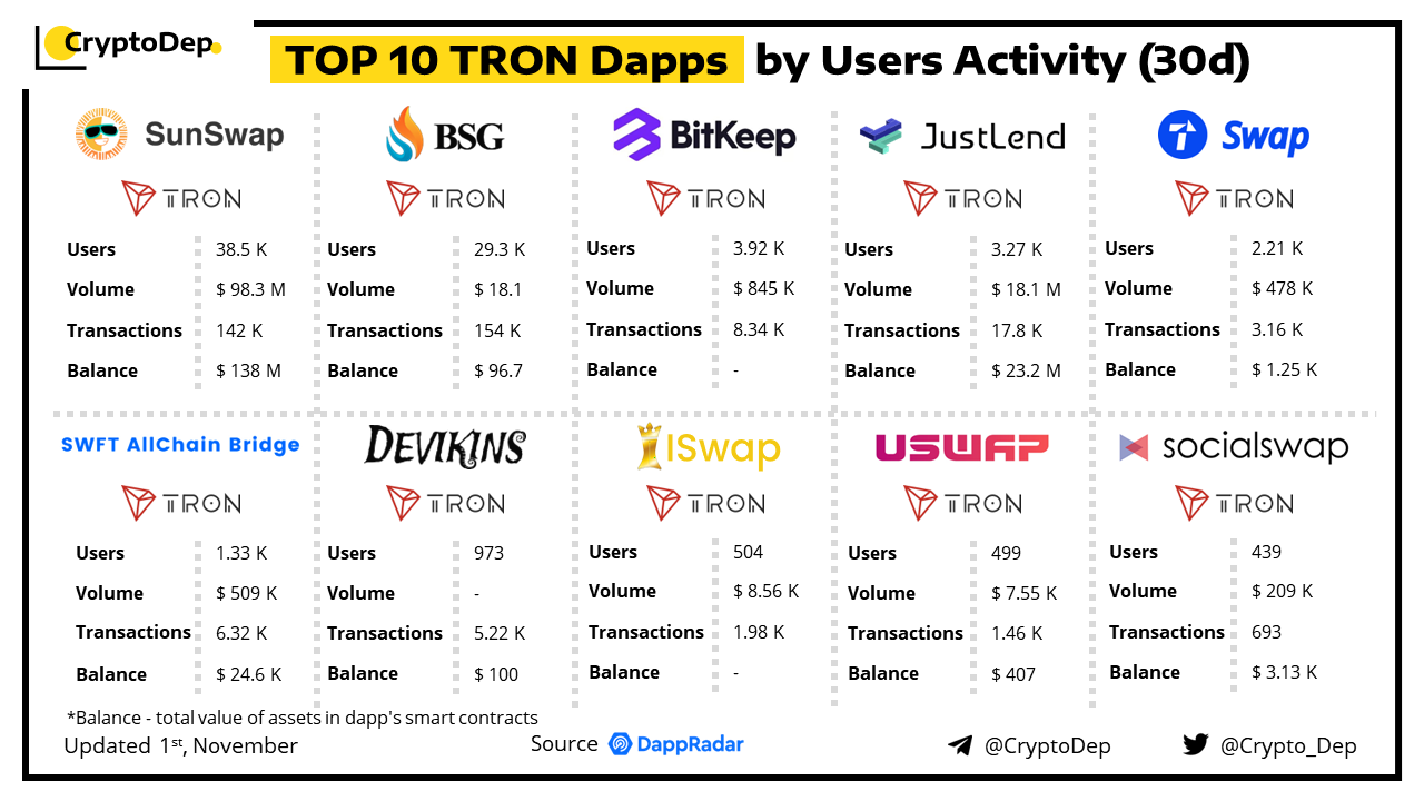 ββTOP 10 TRON Dapps by Users Activity (30d)