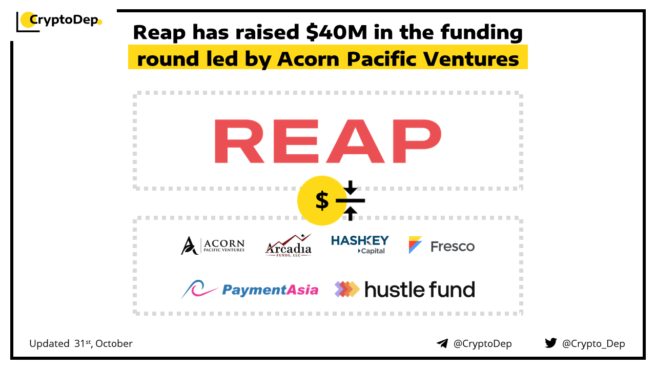 Reap, a Hong Kong based digital payment company has announced the closure of the $40M inestment round that was led by Acorn Pacific Ventures. Arcadia Funds, HashKey Capital, Payment Asia, Hustle Fund, and Fresco Capital have also participated in the round. The company will continue to build Web3 infrastructure in collaboration with cryptocurrency firms to help provide them access to traditional merchants and physical services.