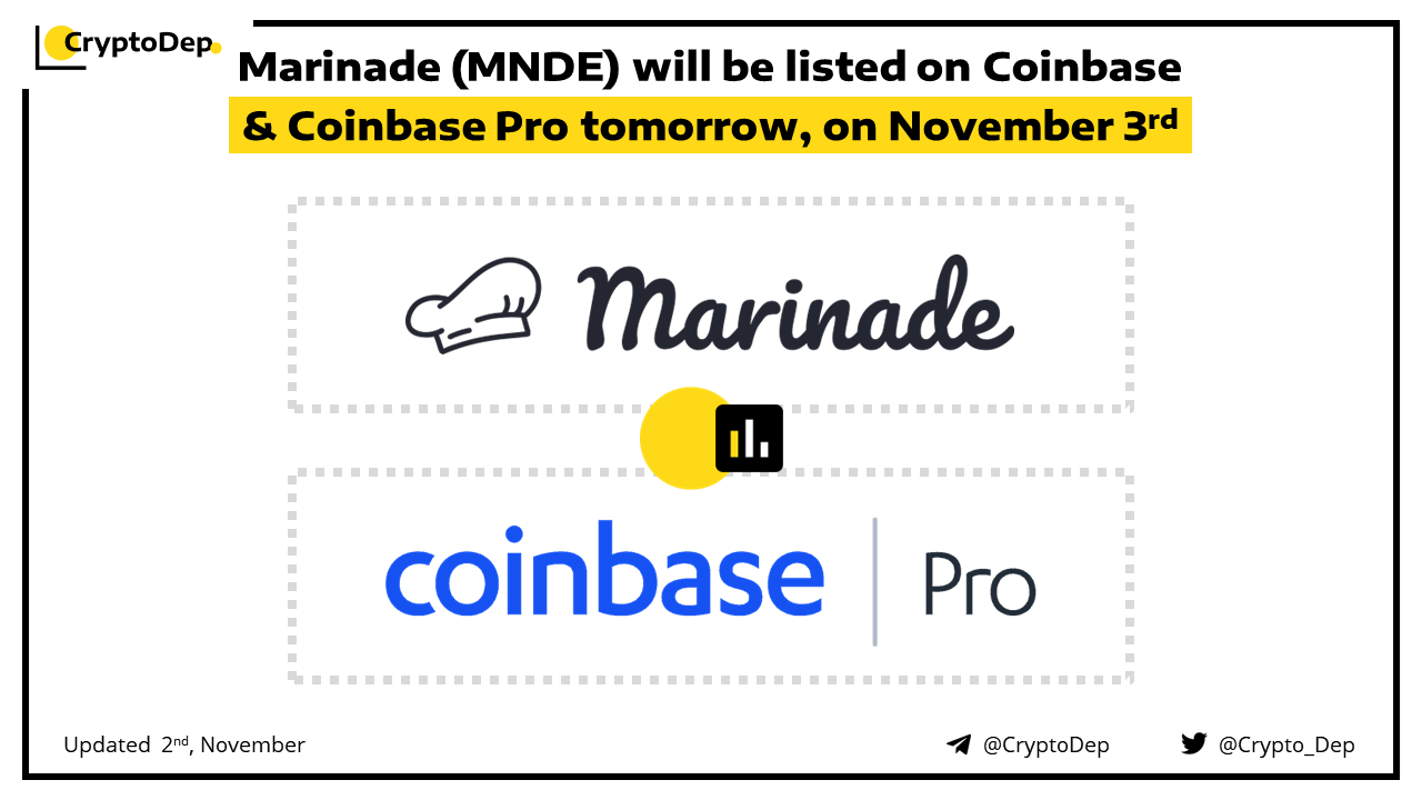 ββMarinade (MNDE) will be listed on Coinbase & Coinbase Pro tomorrow, on November 3rd