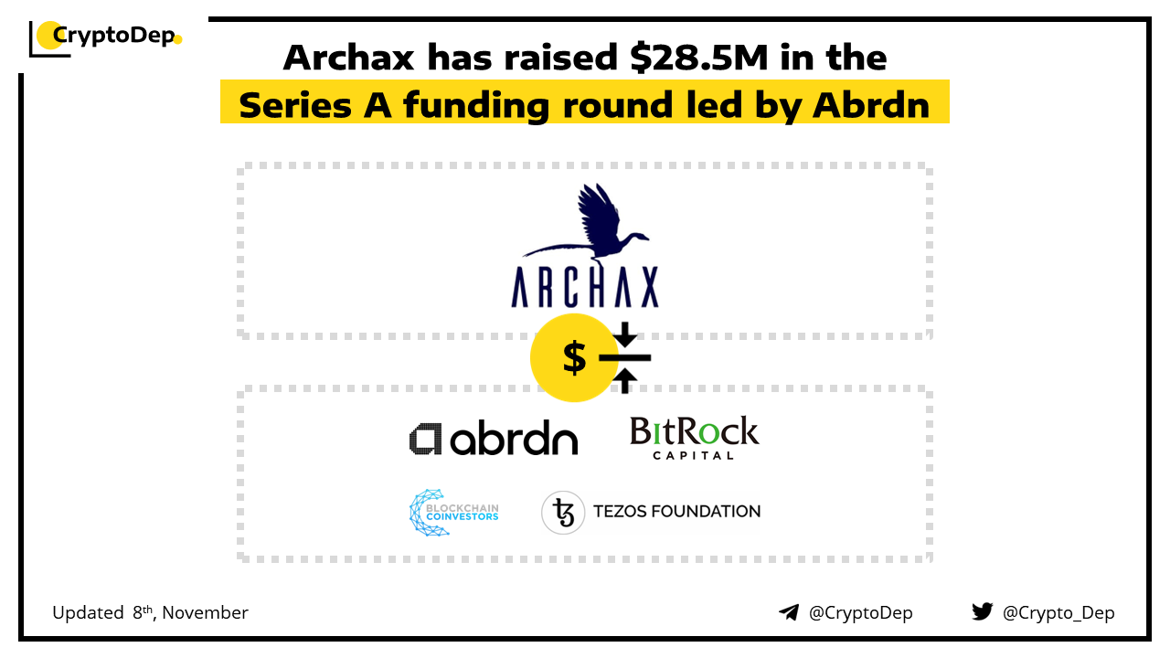 Archax, the UK's only digital asset exchange has closed its $28.5M Series A funding round led by Abrdn. Bitrock Capital, Blockchain Coinvestors and the Tezos Foundation have also participated in the investment. Archax allows institutional investors to custody and trade a variety of digital assets as well as traditional securities.