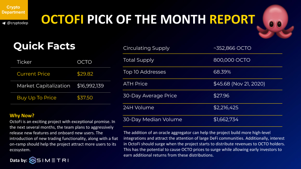 The addition of an oracle aggregator can help the project build more high-level integrations and attract the attention of large DeFi communities. Additionally, interest in OctoFi should surge when the project starts to distribute revenues to OCTO holders. This has the potential to cause OCTO prices to surge while allowing early investors to earn additional returns from these distributions.