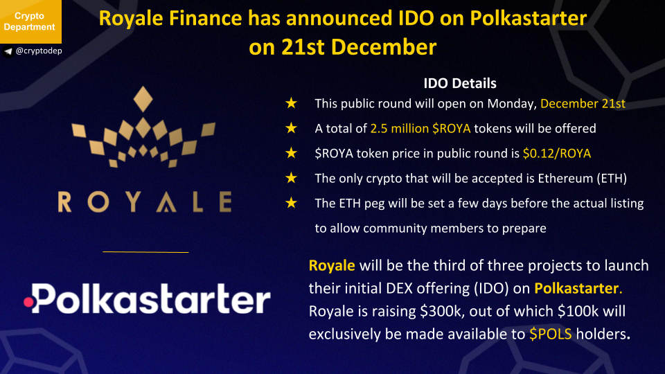 Royale will be the third of three projects to launch their initial DEX offering (IDO) on Polkastarter. Royale is raising $300k, out of which $100k will exclusively be made available to $POLS holders.
