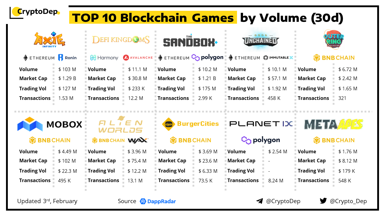 With the spread of Web3 technologies, blockchain games became the industry trend and keep on attracting the attention of gaming & crypto communities. We have made a recap of top blockchain games by volume in the last 30 days, so let's take a look!