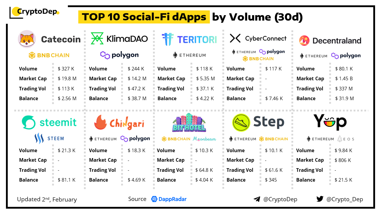 ββTOP 10 Social-Fi dApps by Volume (30d)