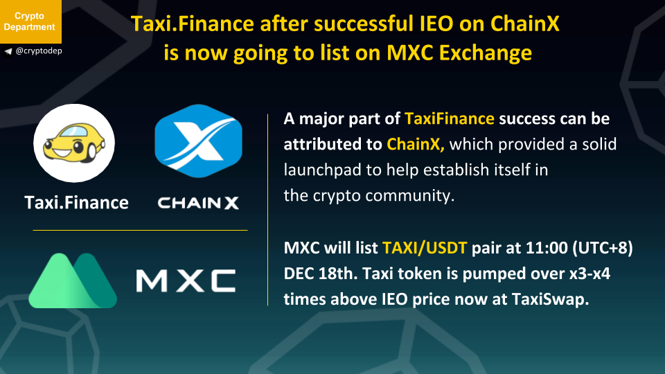 MXC will list TAXI/USDT pair at 11:00 (UTC+8) DEC 18th. Taxi token is pumped over x3-x4 times above IEO price now at TaxiSwap.
