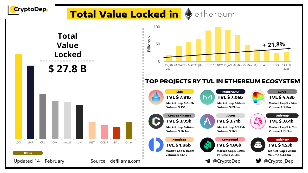 Let's take a look at the general TVL overview of the whole Ethereum ecosystem, diving into the rankings of top chain's protocols by TVL, their market share and current market stats. According to the data from DefiLama, Lido Finance leads by TVL, followed by MakerDao, Curve, Convex, Aave, Uniswap, and others.