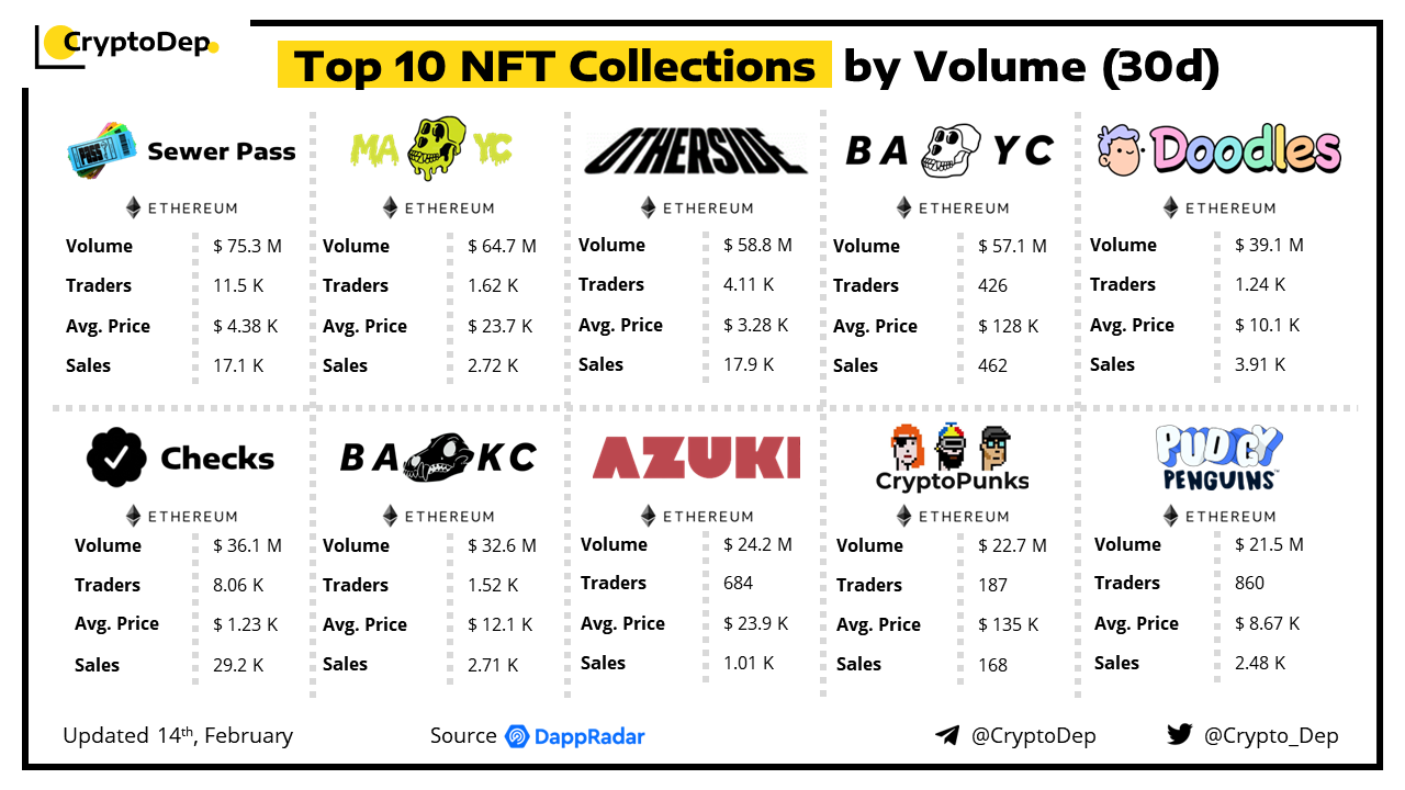 Let's analyze top #NFT collections by volume in the last 30 days, according to the data from DappRadar. Sewer Pass, Mutant Ape Yacht Club, Otherdeed for Otherside, Bored Ape Yacht Club, and Doodles V4 are among the leaders.
