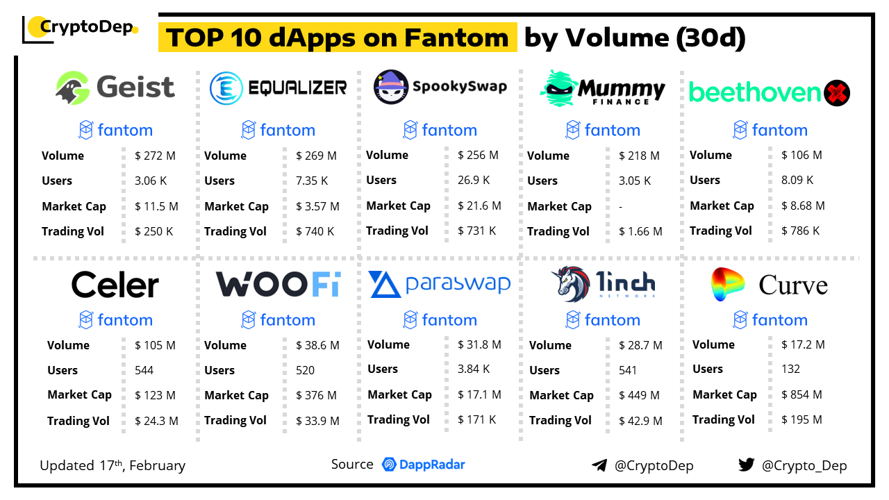 A decentralized application (dApp) is a program built on blockchain that combines a smart contract and a front-end user interface. We present the top dApps on #Fantom by volume in the last 30 days, according to the data from DappRadar.
