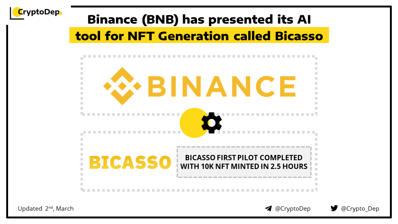 Binance CEO has announced the launch of Bicassso, an AI tool for NFT Generation by Binance. This innovation will allow users to create their own NFTs by typing a description of what they want to have as the result. The beta version was limited to 10,000 mints and reached the limit in 2.5 hours.