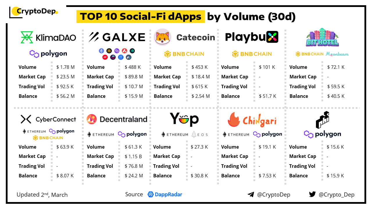 ββTOP 10 Social-Fi dApps by Volume (30d)