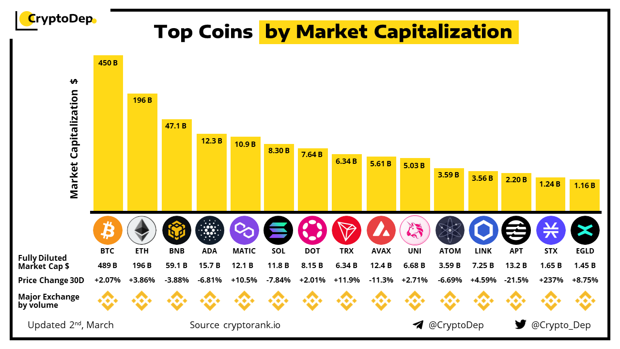 This report depicts the largest cryptocurrency projects, by analyzing the current state of their native tokens. Market capitalization is a metric used to measure the value of a digital asset or a coin, calculated by multiplying the total supply of coins by the current price of a single coin.