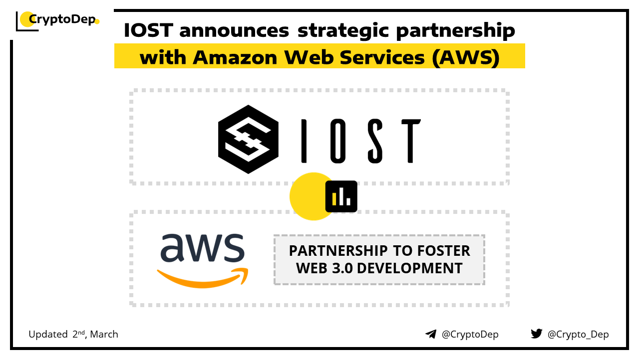 IOST, a decentralized blockchain network, partnered with Amazon Web Services (AWS). Through the partnership, IOST aims to integrate AWS Web 3.0 solutions into its ecosystem and enhance its offerings in DeFi, NFT, GameFi, Web 3, and the metaverse. AWS is a leading cloud computing platform.