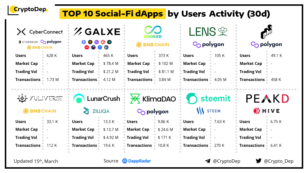 Let's take a look at the top 10 social-fi dApps, based on users' activity over the past 30 days, according to the DappRadar. Social-Fi brings together the principles of social media and DeFi by offering a Web3 approach to creating, managing, and owning social media platforms and the content generated by its participants.