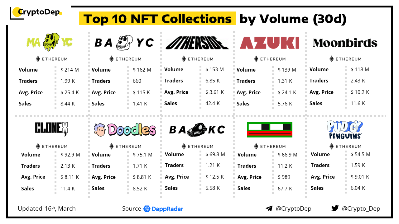Let's analyze top #NFT collections by volume in the last 30 days, according to the data from DappRadar. Mutant Ape Yacht Club, Bored Ape Yacht Club, Otherdeed for Otherside and Azuki are among the leaders.