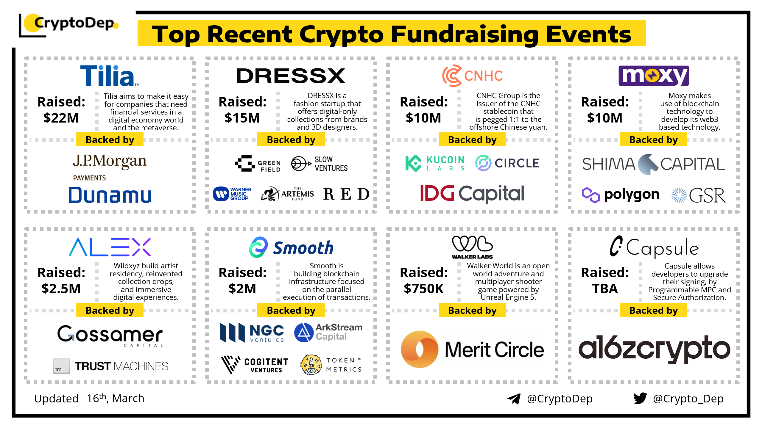 We are excited to present a list of some recent crypto fundraising events, backed by well-known investors such as J.P. Morgan, a16z, Circle Ventures, Shima Capital, GSR, NGC Ventures, ArkStream Capital, Token Metrics, Polygon, Merit Circle, Warner Music Group, and others. Let's take a look!