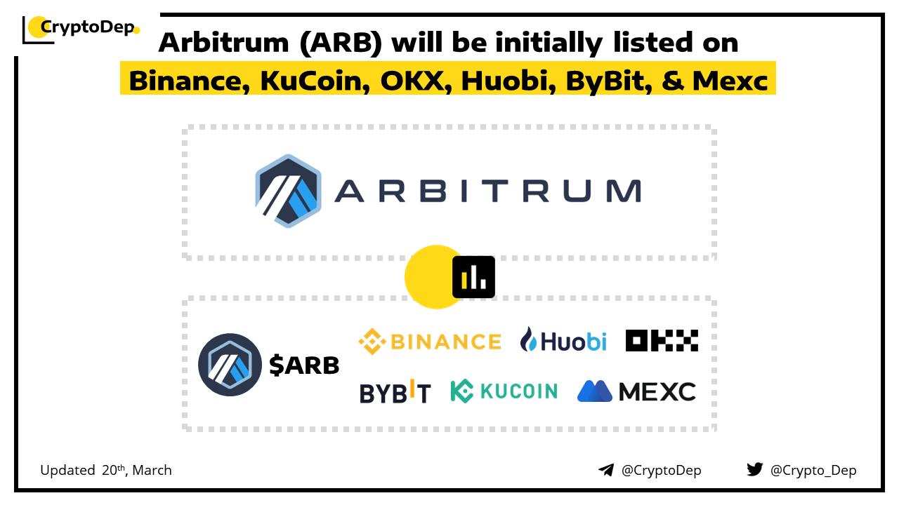Arbitrum (ARB) will be initially listed on Binance, KuCoin, OKX, Huobi, ByBit, & Mexc