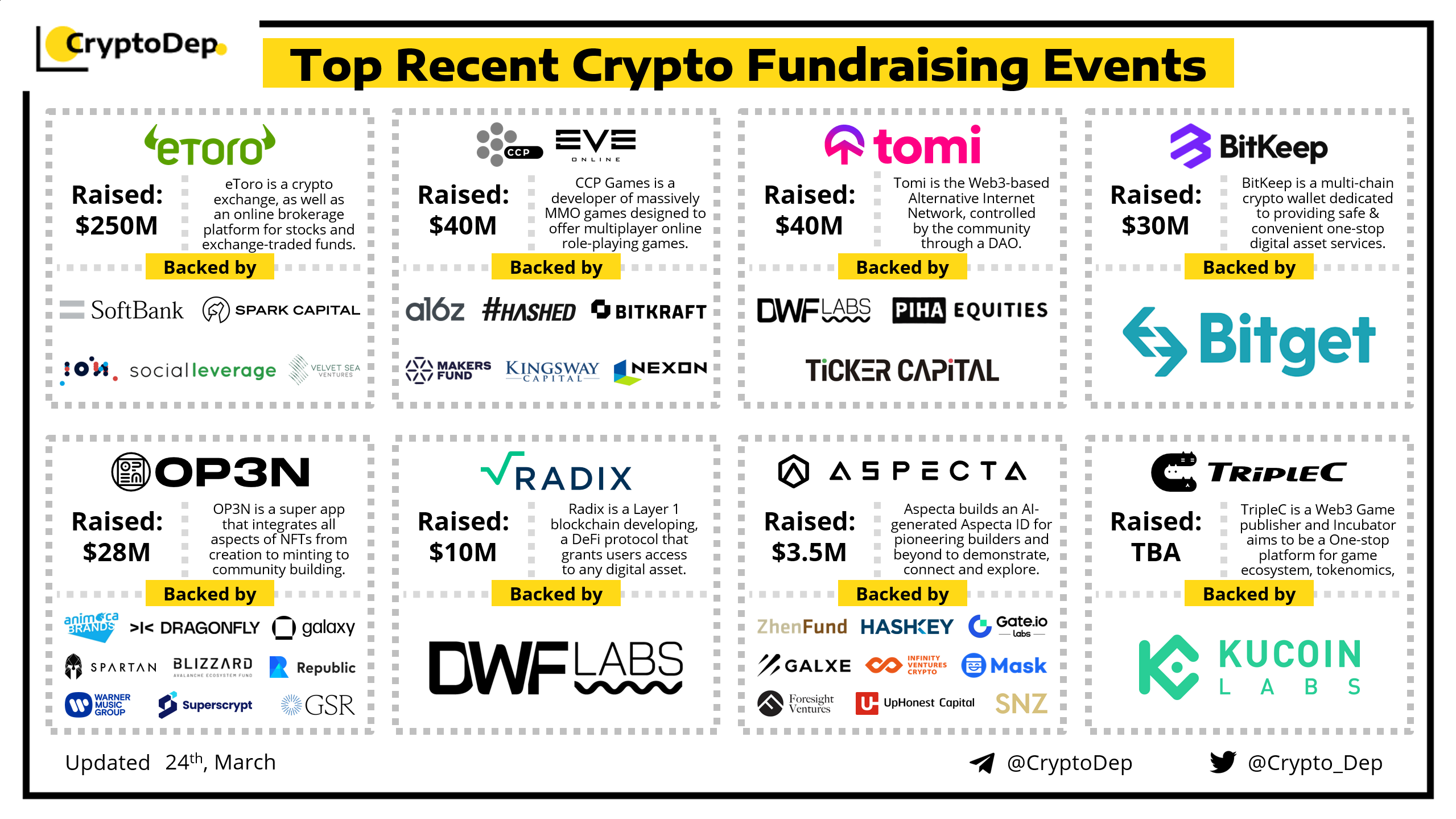 We are excited to present a list of some recent crypto fundraising events, backed by well-known investors such as a16z, SoftBank, Hashed, Animoca Brands, Hashkey, Bitkraft, Dragonfly, Makers Fund, Galaxy, DWF Labs, Blizzard Fund, Warner Music, Spartan, Infinity Ventures Crypto, GSR, KuCoin Labs, Gate, Bitget, Galxe, Mask Network, and others. Let's take a look!
