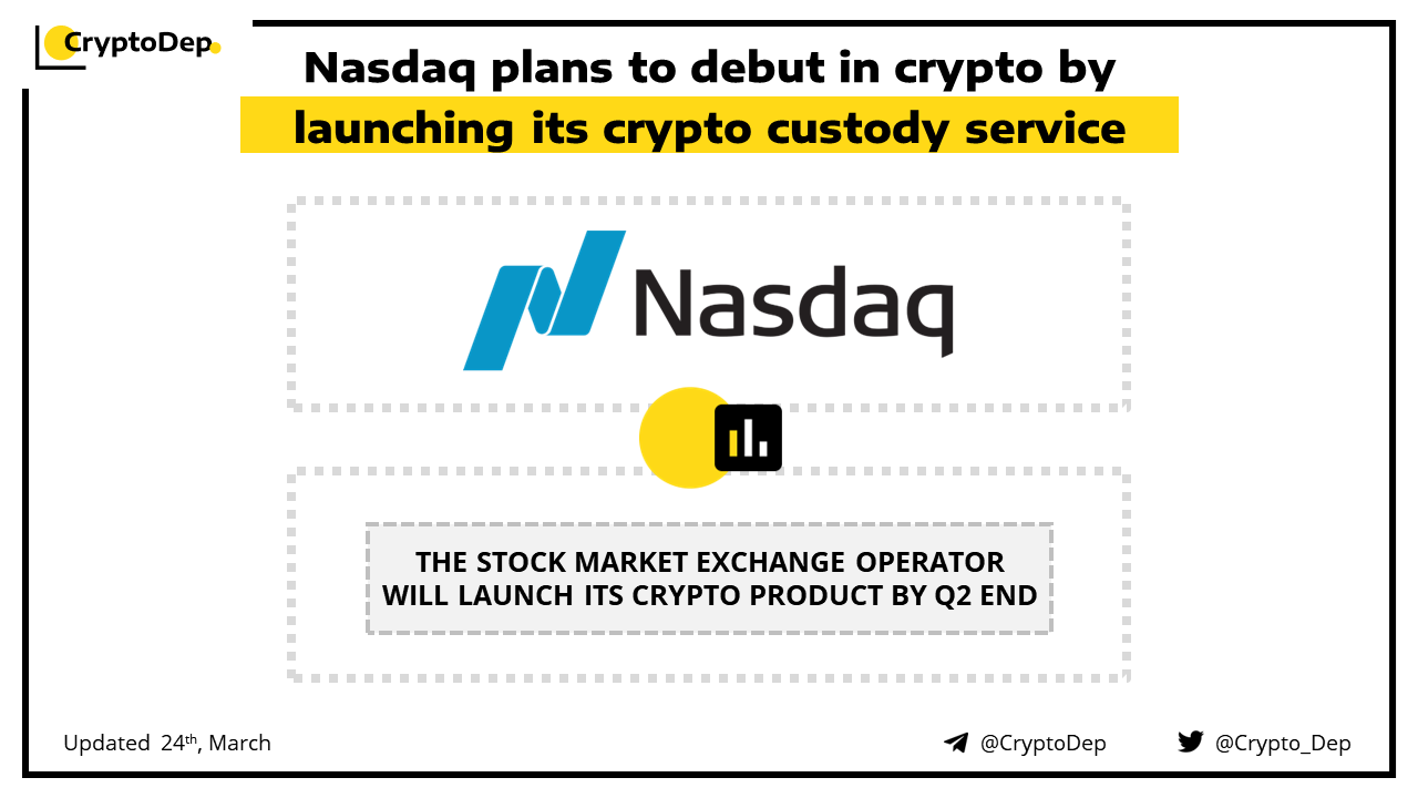 Nasdaq, a stock market exchange operator will expand its offering in crypto by launching the crypto custody service, by the end of Q2. Nasdaq applied to the New York Department of Financial Services for a limited-purpose trust company charter that would oversee its custody service.