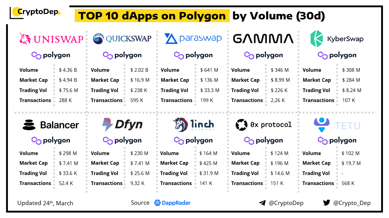 A decentralized application (dApp) is a program built on blockchain that combines a smart contract and a front-end user interface. We present the top dApps on #Polygon by volume in the last 30 days, according to the data from DappRadar.