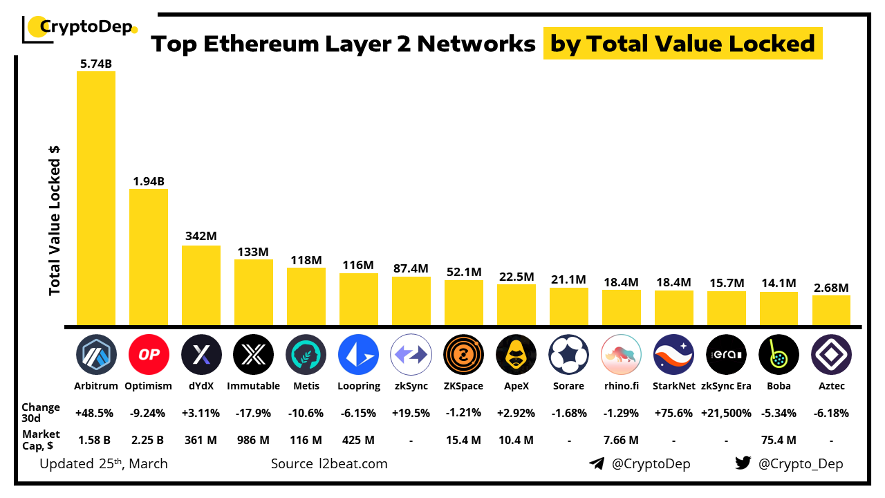 TVL is the overall value of crypto assets deposited in Ethereum Layer 2 networks. The overall TVL among all projects now equals $8.67B with Arbitrum $ARB, Optimism $OP, dYdX $DYDX, Immutable $IMX, and Metis $METIS making the top leaders.