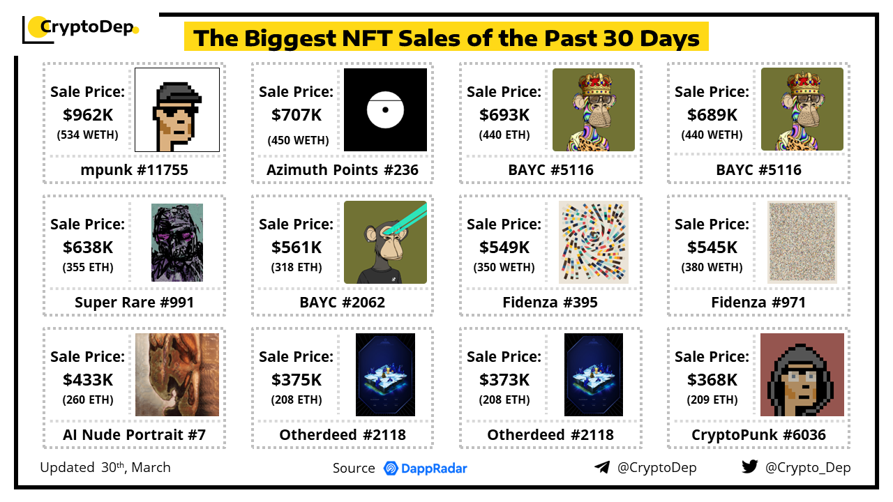 In this post, we highlight the largest Non-Fungible Token (NFT) sales that have occurred over the past month, delving into the details of each sale, including the specific NFT that was sold, and the price it fetched. Data from DappRadar.