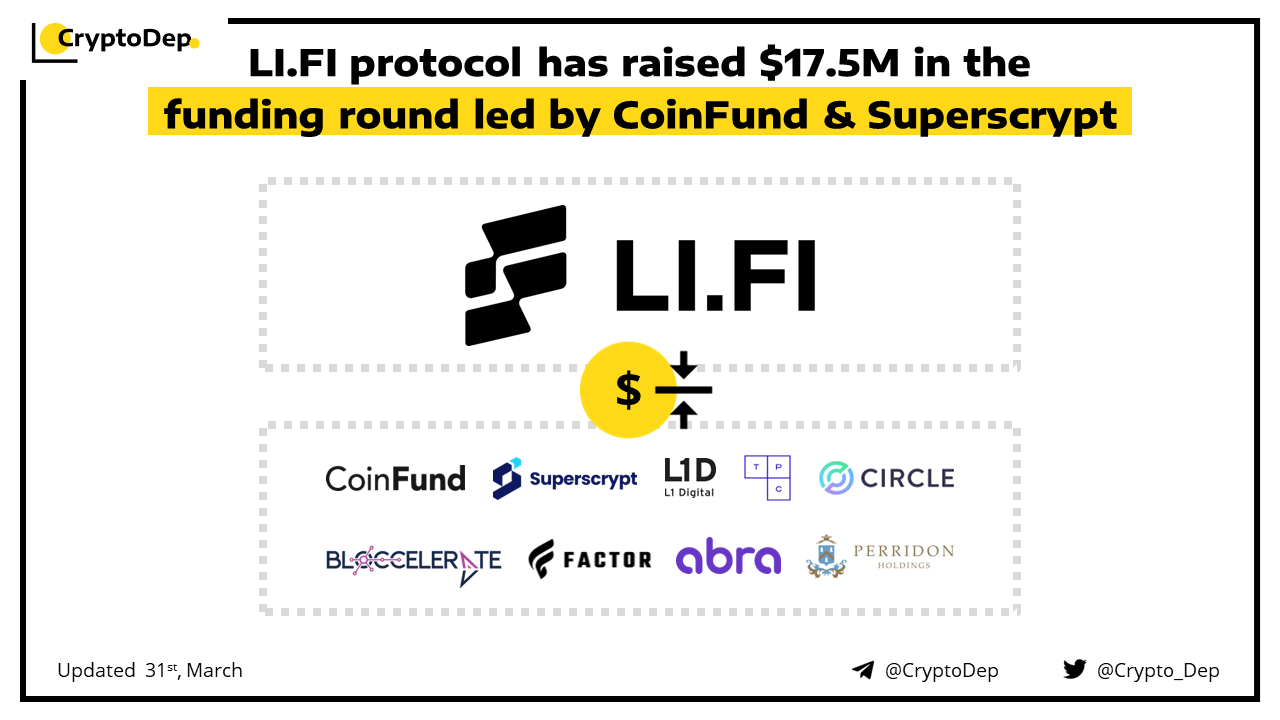 LŠ.FŠ, an infrastructure protocol that aggregates cross-chain bridges and DEXs has closed its $17.5M Series A funding round led by CoinFund and Superscrypt. Additional round participants included Circle, Bloccelerate, Factor DAO, Perridon, L1 Digital, Theta Blockchain Ventures, Three Point Capital, and Abra. LI.FI is a multi-chain liquidity and data gateway that provides access to nearly 20 blockchains, enabling asset movement and data sharing by aggregating infrastructure solutions such as cross-chain bridges, relevant data sources, and decentralized exchanges.