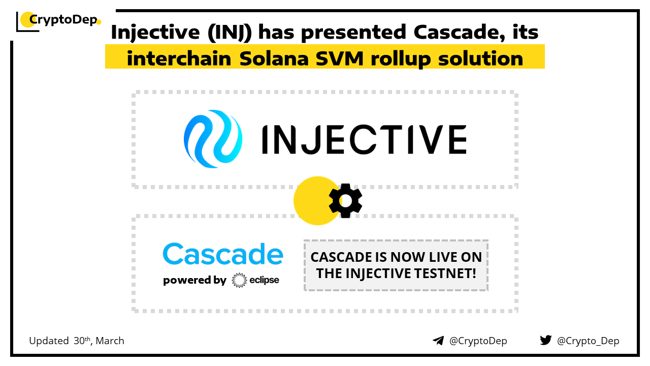 Injective has released Cascade, the Solana SVM rollup for the IBC ecosystem, the launch was facilitated by customizable rollup provider Eclipse. Cascade is now live on the Injective testnet with a migration to mainnet planned in the near future. Injective is an open, interoperable blockchain optimized for DeFi applications.