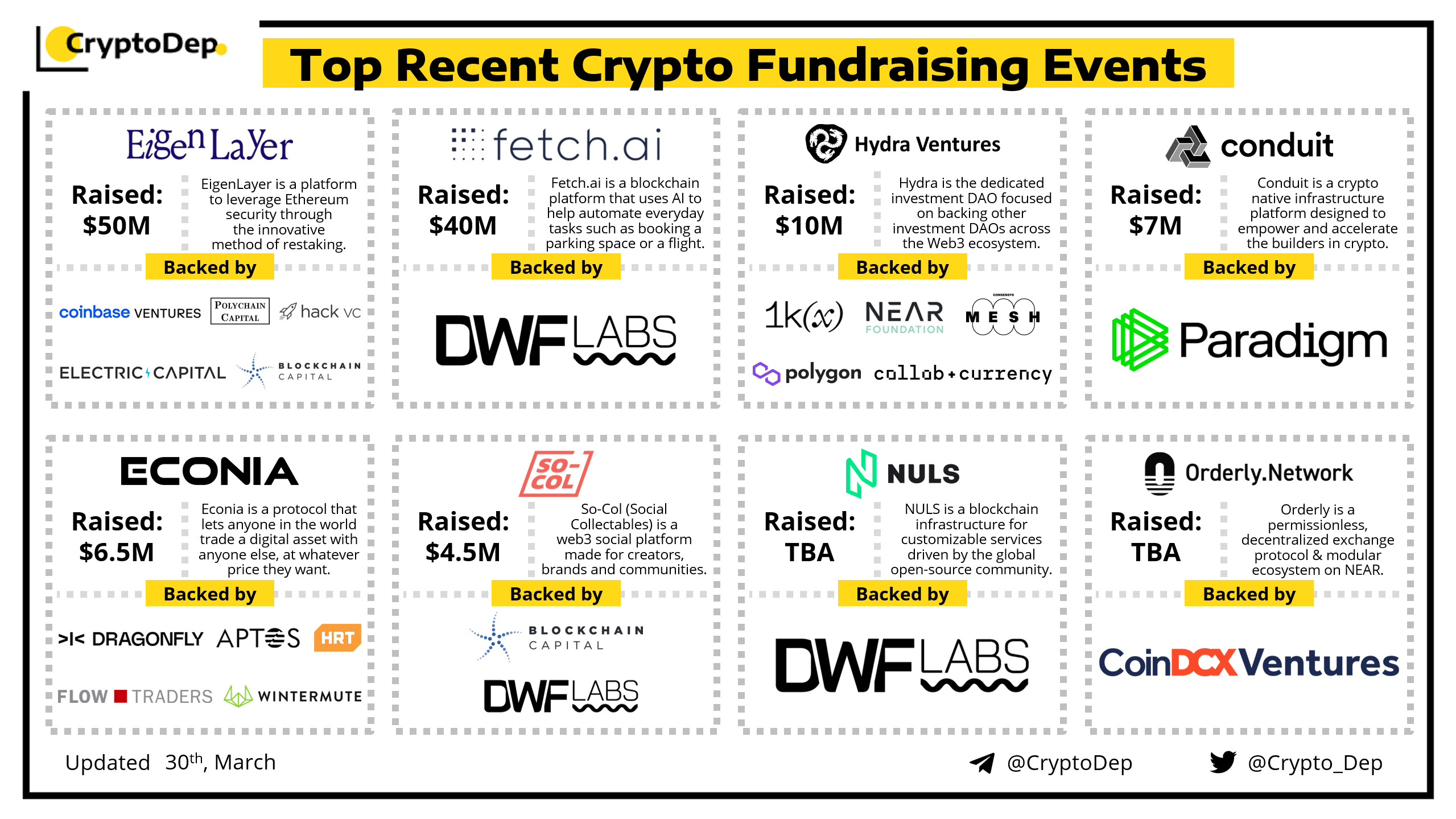 We are excited to present a list of some recent crypto fundraising events, backed by well-known investors such Paradigm, Coinbase Ventures, Polychain Capital, Blockchain Capital, Dragonfly, Electric Capital, Wintermute, DWF Labs, Aptos, Near Foundation, Polygon, and others. Let's take a look!