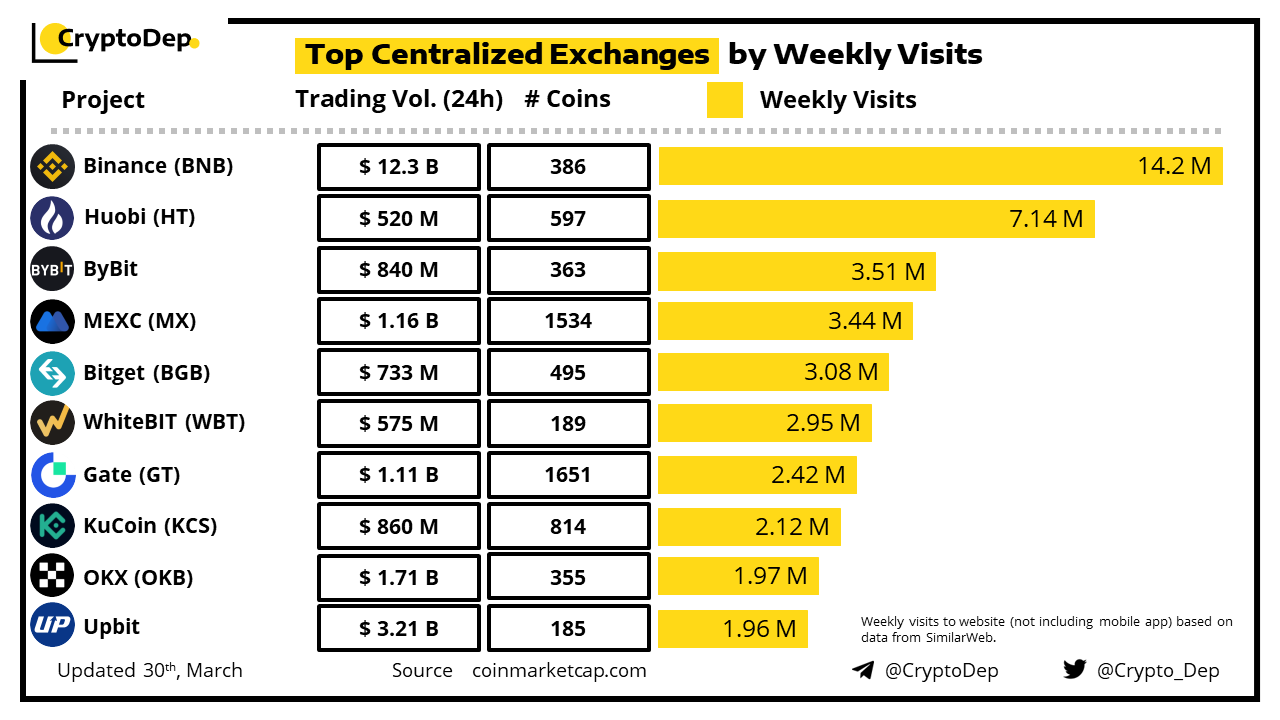Let's take a look at the ranking of top centralized exchanges by weekly visits. Weekly visits to the website (not including mobile app) based on data from SimilarWeb and CoinmarketCap.