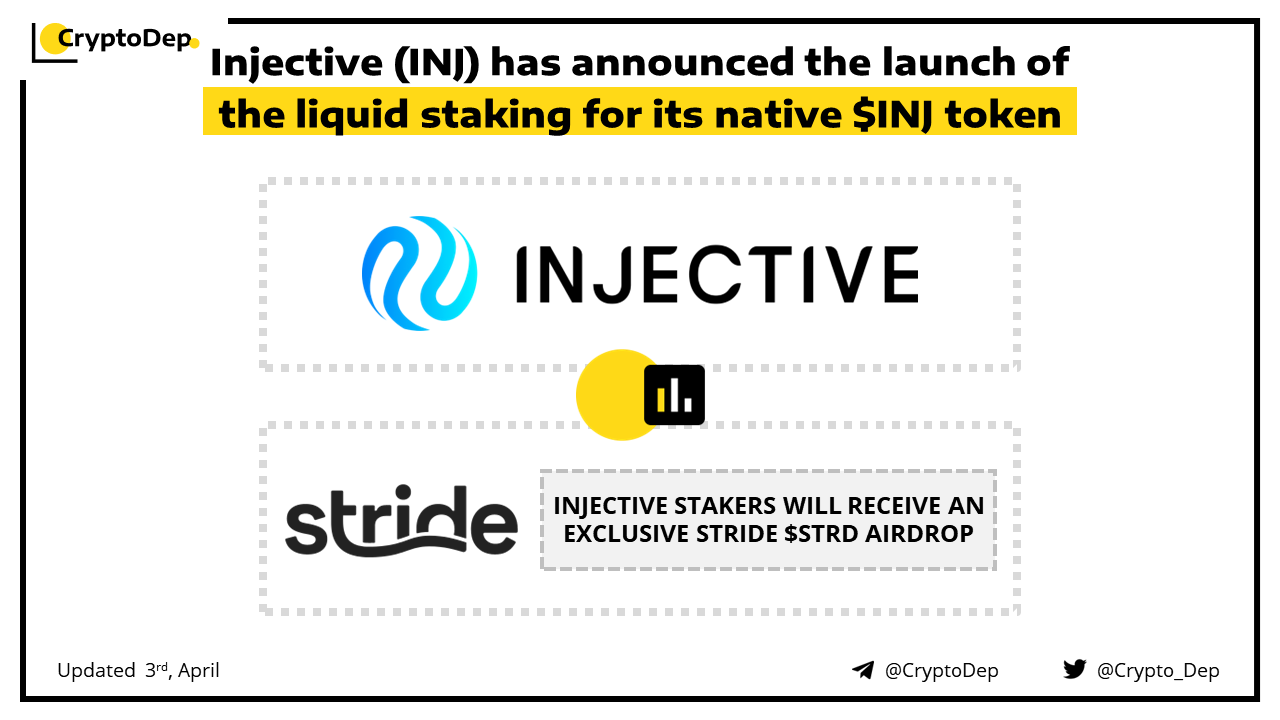 Injective to kick off its liquid staking for its native token INJ in partnership with Stride, a specialized app chain for liquid staking. To celebrate the launch, Injective stakers will receive an exclusive Stride (STRD) airdrop, enabling the community to take part in governing the Stride DAO that helped to create stINJ. Injective is an open, interoperable blockchain optimized for DeFi applications.
