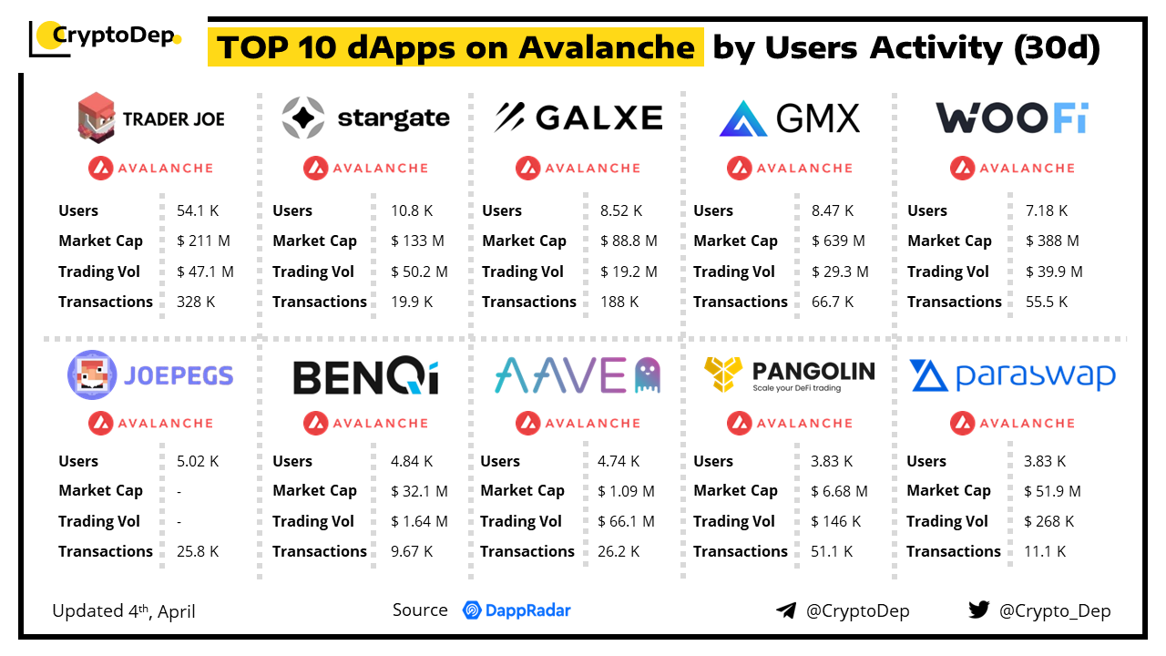 A decentralized application (dApp) is a program built on blockchain that combines a smart contract and a front-end user interface. We present the top dApps on #Avalanche by users activity in the last 30 days, according to the data from DappRadar.