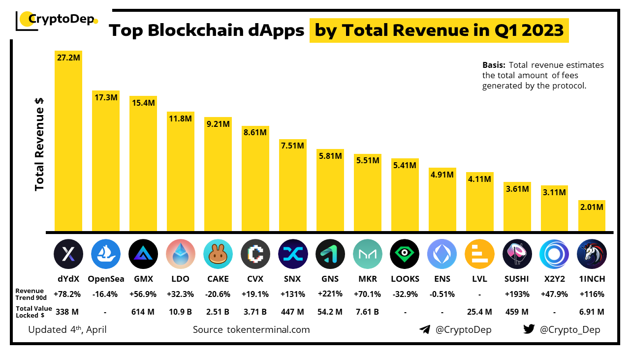 Decentralized applications (dApps) operate on a blockchain network and have gained popularity in recent years. In this post, we analyze the data from Token Terminal and rank the top blockchain dApps by total revenue in the first quarter of 2023.