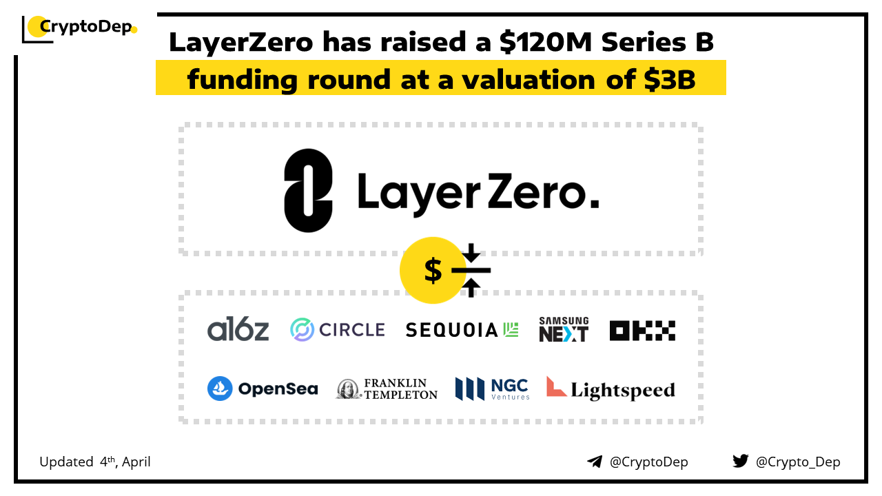 LayerZero Labs, the developer of the blockchain interoperability protocol LayerZero, raised $120M in Series B funding and reached a $3B valuation. Investors in the round included a16z, Sequoia Capital, Circle Ventures, OpenSea, and Samsung Next, along with 33 backers, including OKX, Lightspeed Venture Partners, Franklin Templeton and NGC Ventures. Previously, it has closed a $135M Series A round at a $1B valuation from Coinbase Ventures, PayPal Ventures, Uniswap Labs Ventures, and Tiger Global.
