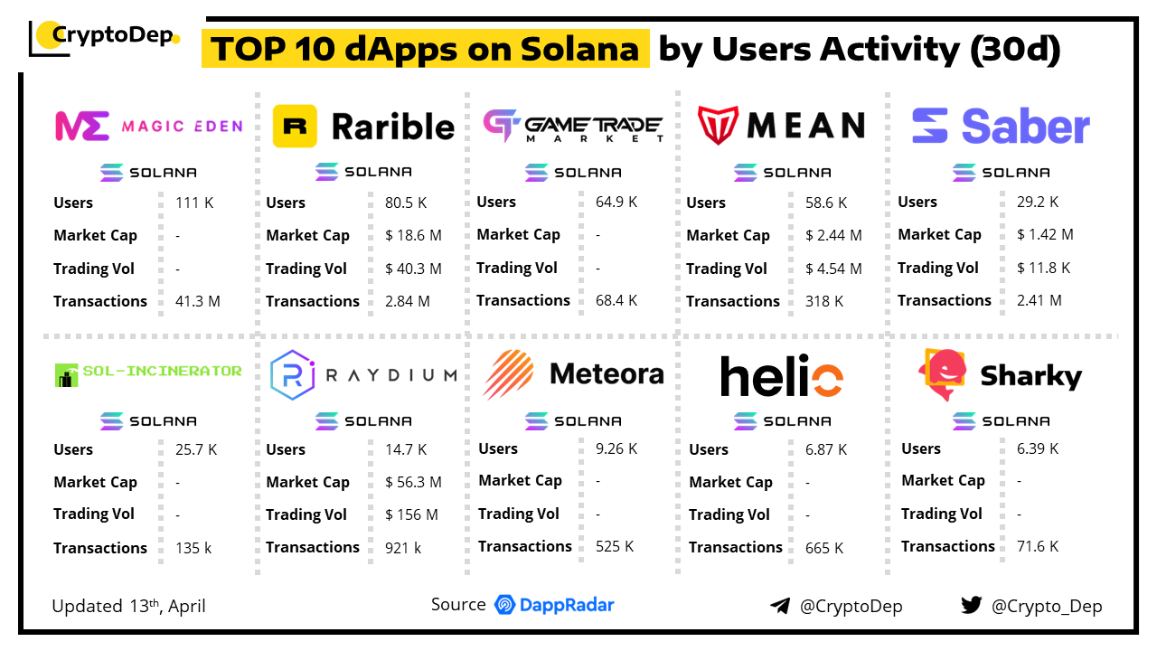A decentralized application (dApp) is a program built on blockchain that combines a smart contract and a front-end user interface. We present the top dApps on #Solana by users activity in the last 30 days, according to the data from DappRadar.