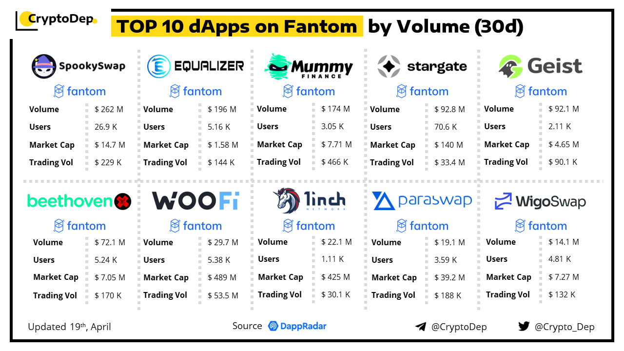 A decentralized application (dApp) is a program built on blockchain that combines a smart contract and a front-end user interface. We present the top dApps on #Fantom by volume in the last 30 days, according to the data from DappRadar.
