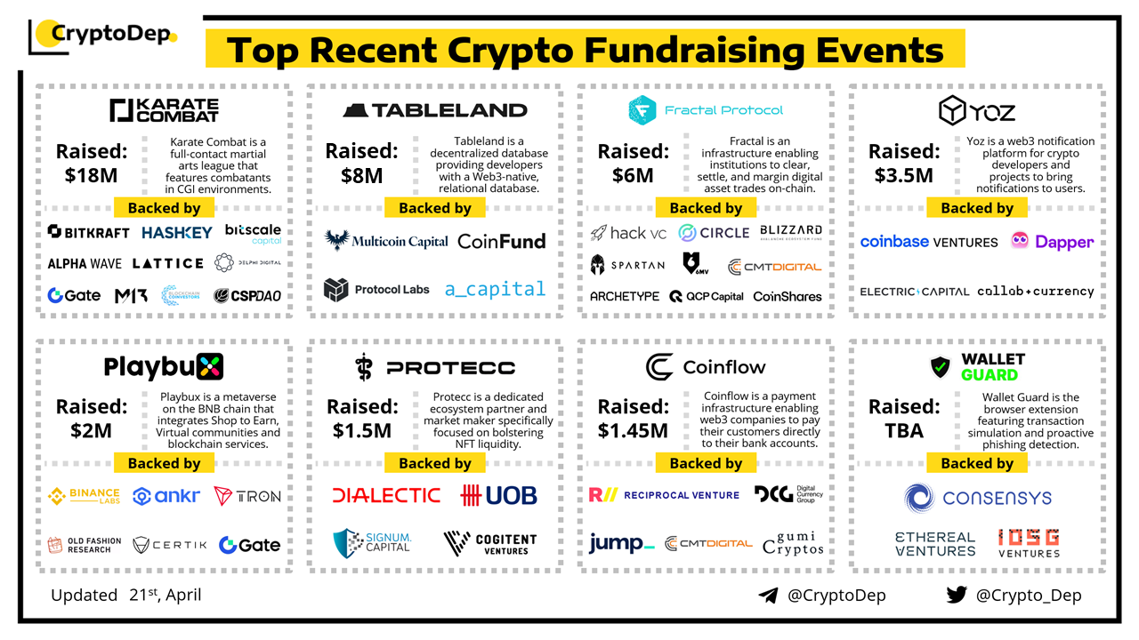 We are excited to present a list of some recent crypto fundraising events, backed by well-known investors such as Binance Labs, Hashkey, Bitkraft Ventures, Circle Ventures, ConsenSys, Multicoin Capital, Jump Crypto, Coinbase Ventures, CoinFund, Dapper Labs, Ankr, Tron, and others.