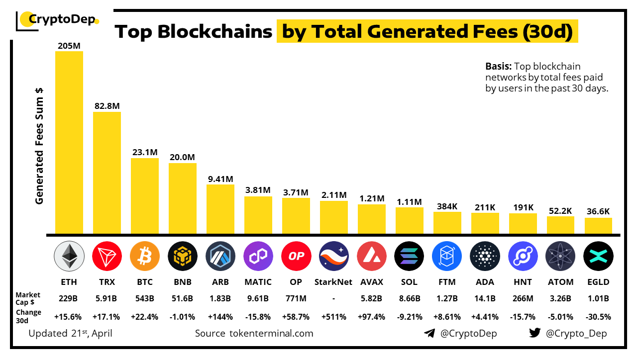 Let's take a look at the ranking of top blockchain networks by total fees paid by users in the past 30 days, according to the data from Tokenterminal.