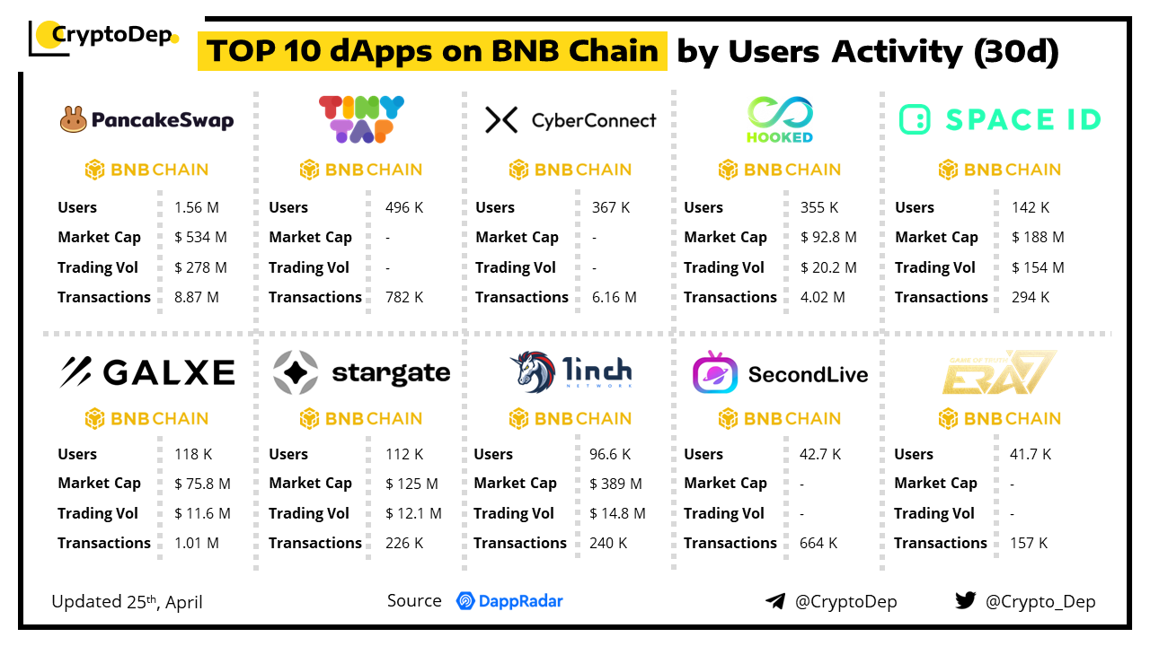 A decentralized application (dApp) is a program built on blockchain that combines a smart contract and a front-end user interface. We present the top dApps on #BNBChain by users activity in the last 30 days, according to the data from DappRadar.