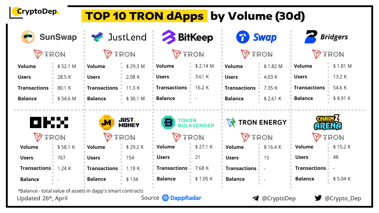 A decentralized application (dApp) is a program built on blockchain that combines a smart contract and a front-end user interface. We present the top dApps on #Tron by volume in the last 30 days, according to the data from DappRadar.