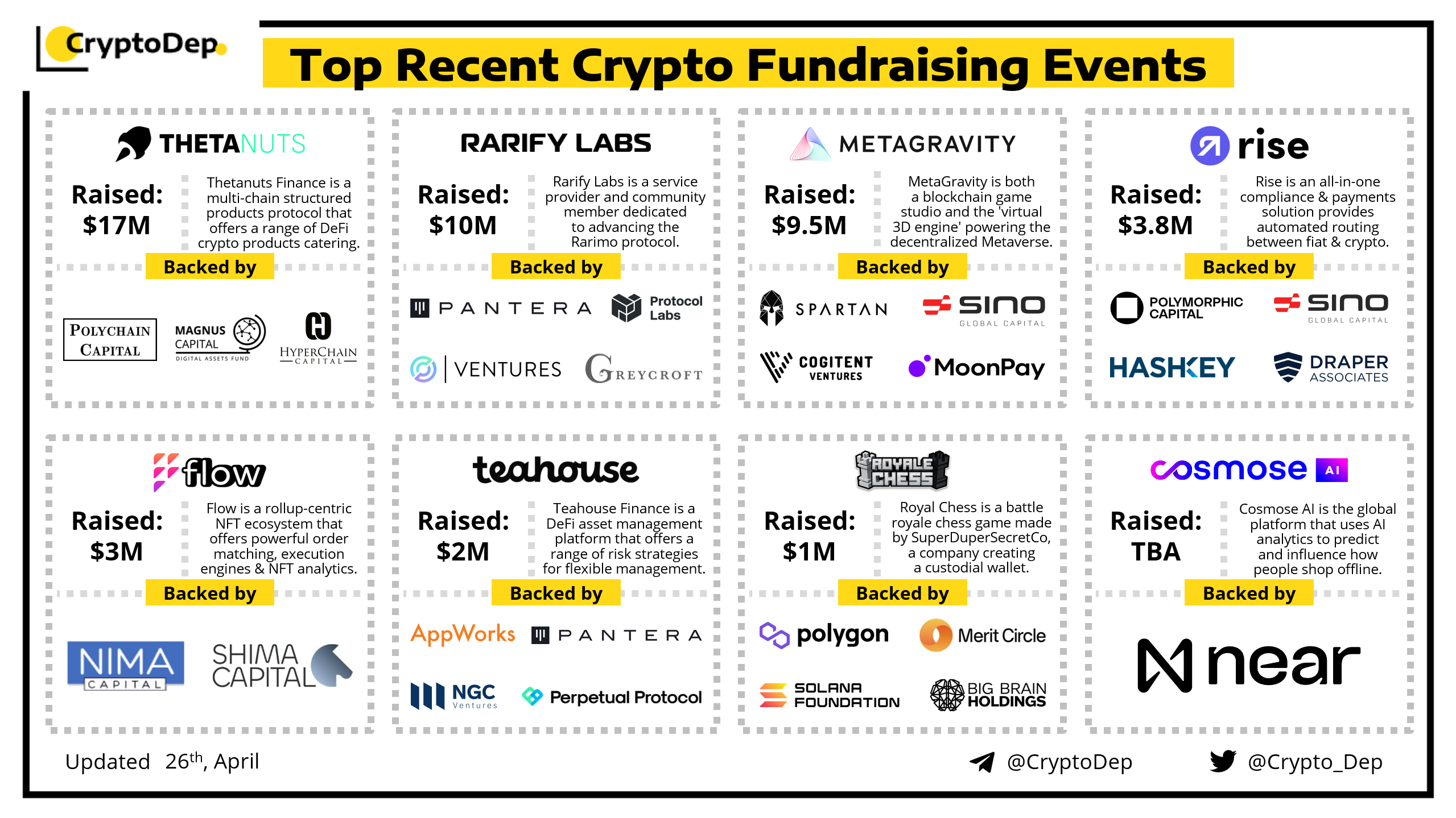 We are excited to present a list of some recent crypto fundraising events, backed by well-known investors such as Pantera Capital, Polychain Capital, Circle Ventures, Shima Capital, Hashkey, NGC Ventures, Sino Global Capital, Spartan, Polygon, Merit Circle, Solana Foundation, Near Foundation, and others. Let's take a look!