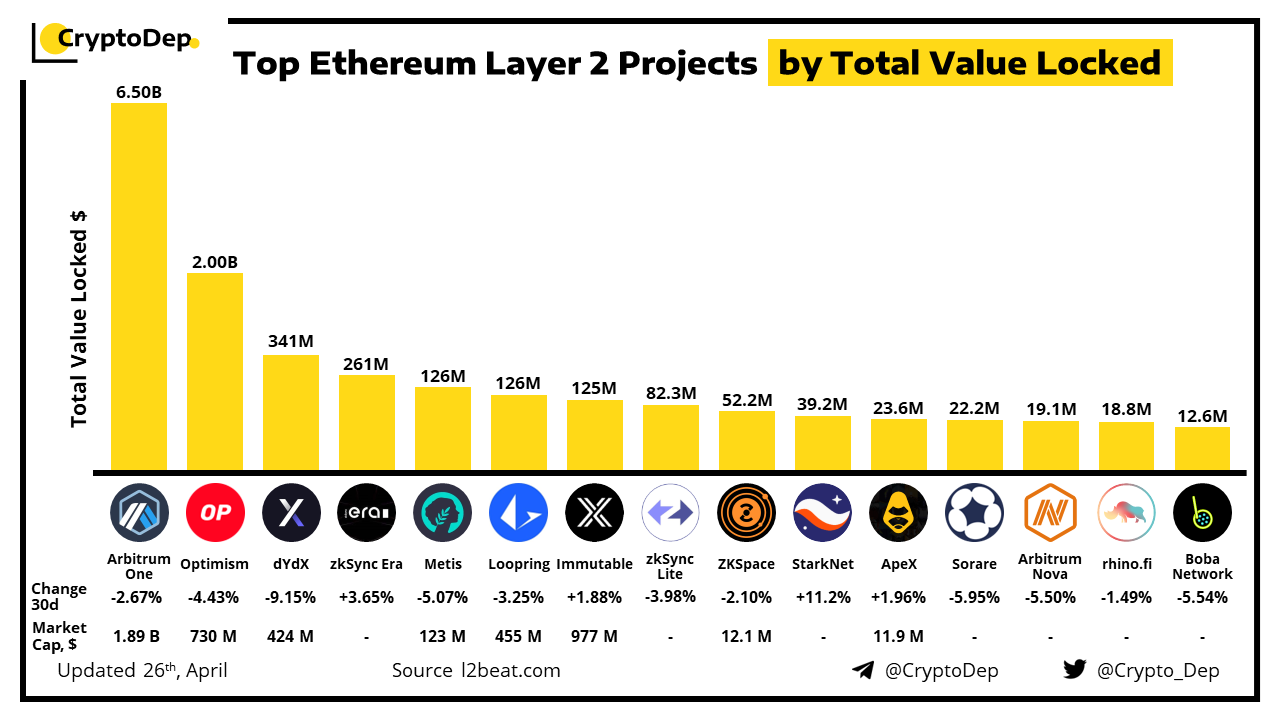 TVL is the overall value of crypto assets deposited in Ethereum Layer 2 networks. The overall TVL among all projects now equals $9.77B with Arbitrum $ARB, Optimism $OP, dYdX $DYDX, zkSync Era, and Metis $METIS making the top leaders.