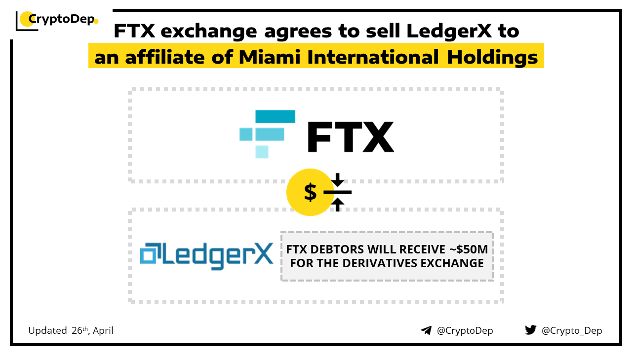 FTX debtors will sell its LedgerX derivatives exchange for about $50M for to an affiliate of Miami International Holdings. The deal to M7 Holdings needs to be approved by the U.S. bankruptcy court overseeing FTX's proceedings. FTX secured approval early this year to sell business units to raise money for creditors.