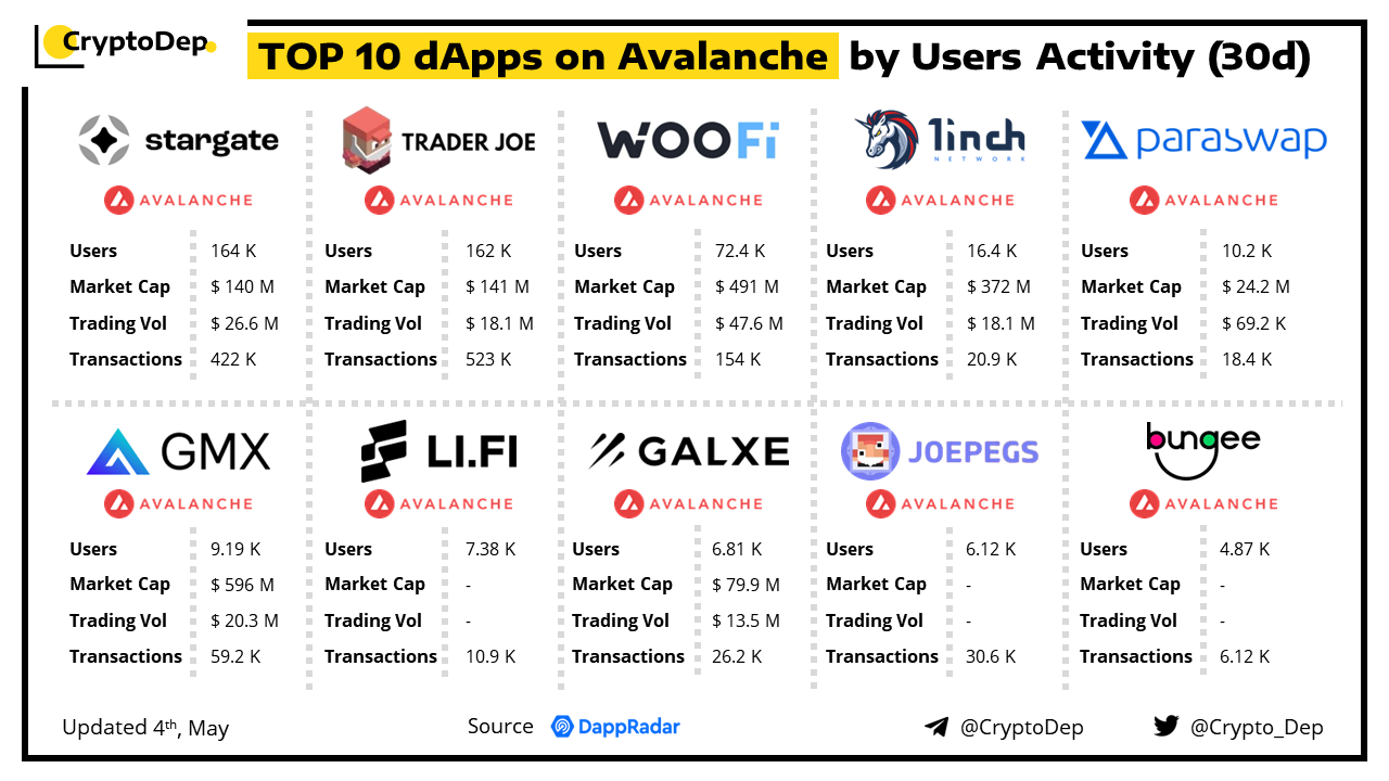 A decentralized application (dApp) is a program built on blockchain that combines a smart contract and a front-end user interface. We present the top dApps on #Avalanche by users activity in the last 30 days, according to the data from DappRadar.