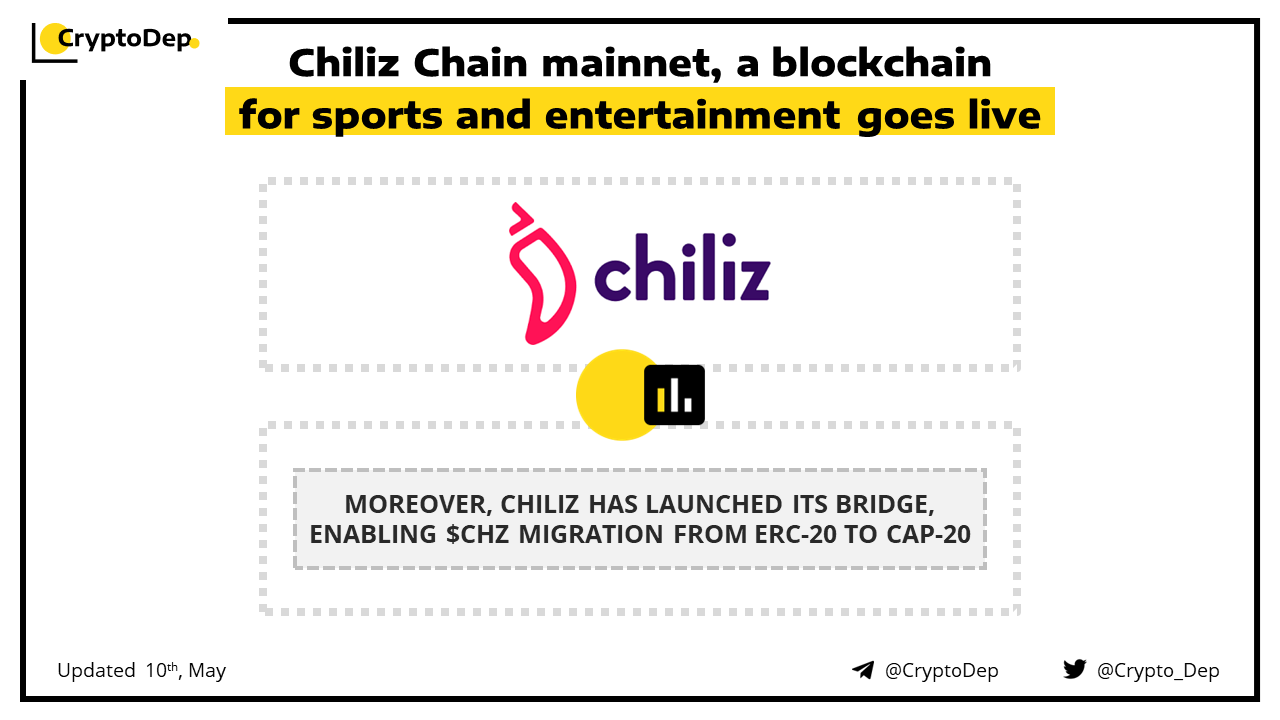 Chiliz launches its Chiliz Chain mainnet, a Layer-1, EMV-compatible, Proof-of-Stake Authority (PoSA) blockchain infrastructure for sports and entertainment. Moreover, Chiliz has launched its bridge, enabling $CHZ token migration from ERC-20 to CAP-20. Chiliz will drive innovation on the Chiliz Chain through its $50M accelerator program Chiliz Labs, backed by Jump Crypto.