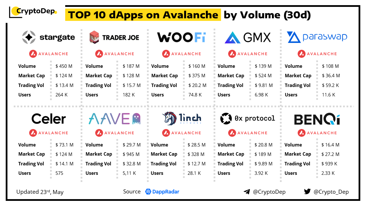 A decentralized application (dApp) is a program built on blockchain that combines a smart contract and a front-end user interface. We present the top dApps on #Avalanche by volume in the last 30 days, according to the data from DappRadar.