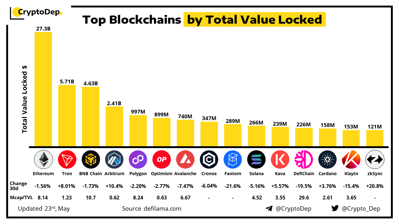 The overall value of crypto assets deposited in blockchain protocols is about $47.9B. Ethereum $ETH, Tron $TRX, BNB Chain $BNB, Arbitrum, and Polygon $MATIC are among the leaders, according to the data from DeFillama.