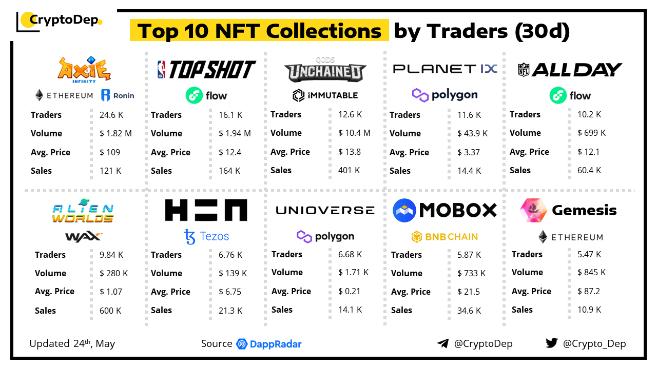 In this post, we analyze top NFT collections by the number of traders in the last 30 days, according to the data from DappRadar. Let's take a look!