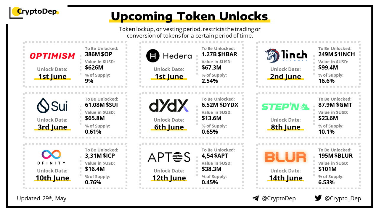 Let's take a look at the compilation of major upcoming token unlocks, diving into details such as dates, amounts, and projects related to tokens that are currently locked up, but will soon be released to the market. During the next few weeks, $OP, $BLUR, $1INCH, $HBAR, and $SUI will have the biggest unlocks.
