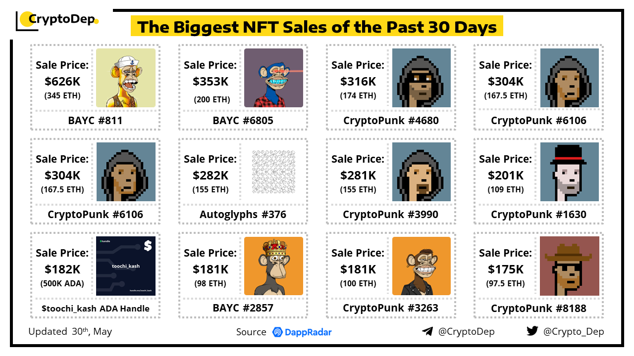 In this post, we highlight the largest Non-Fungible Token (NFT) sales that have occurred over the past month, delving into the details of each sale, including the specific NFT that was sold, and the price it fetched. Data from DappRadar.